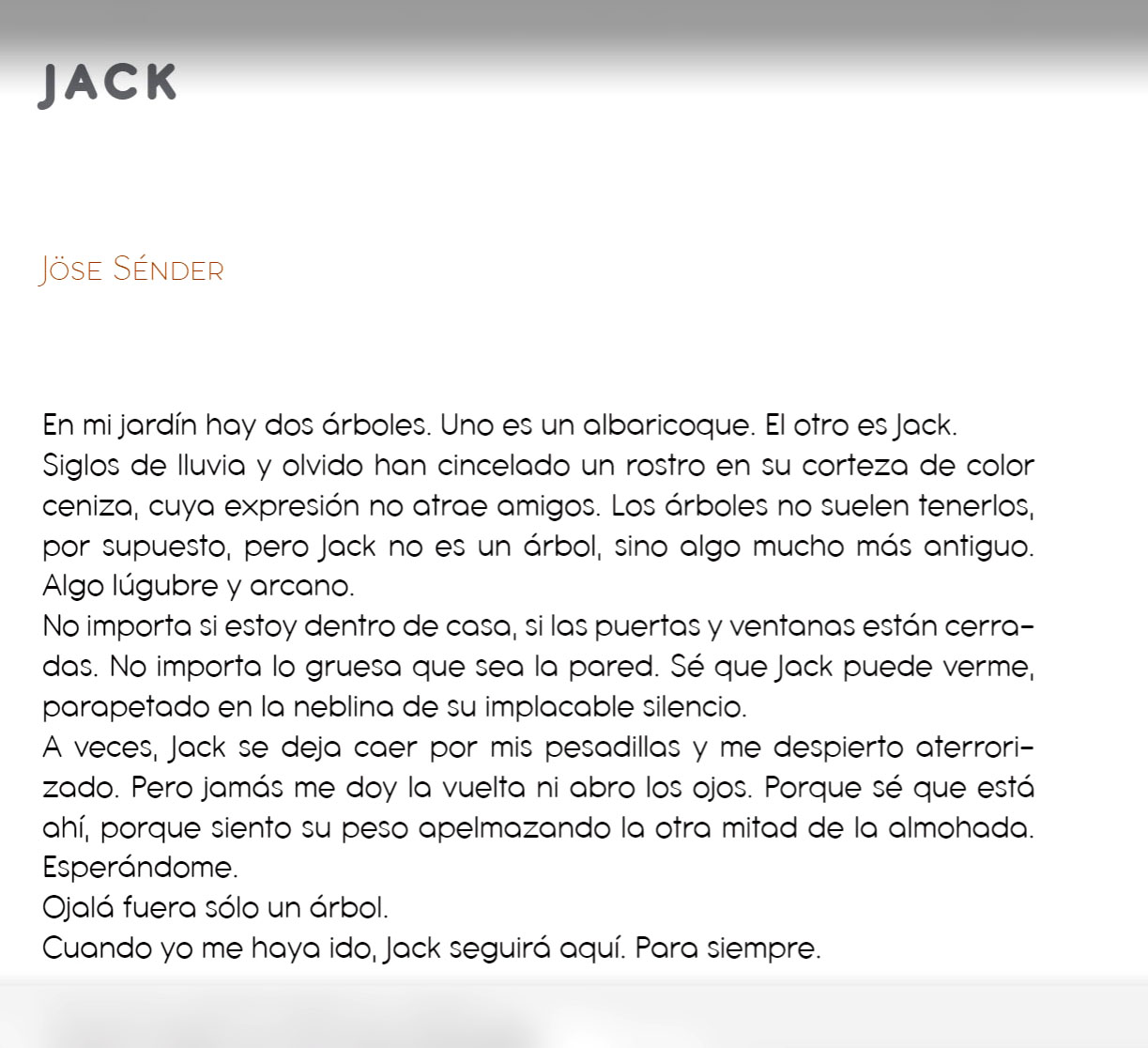 Podéis leer la revista entera gratis en su web (mi relato está en la página 28), es muy interesante de ver. Aquí abajo, de todos modos, os dejo una captura de mi brevísimo relato de terror, titulado “Jack“.