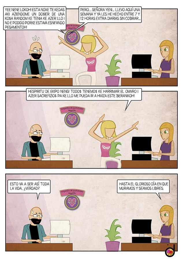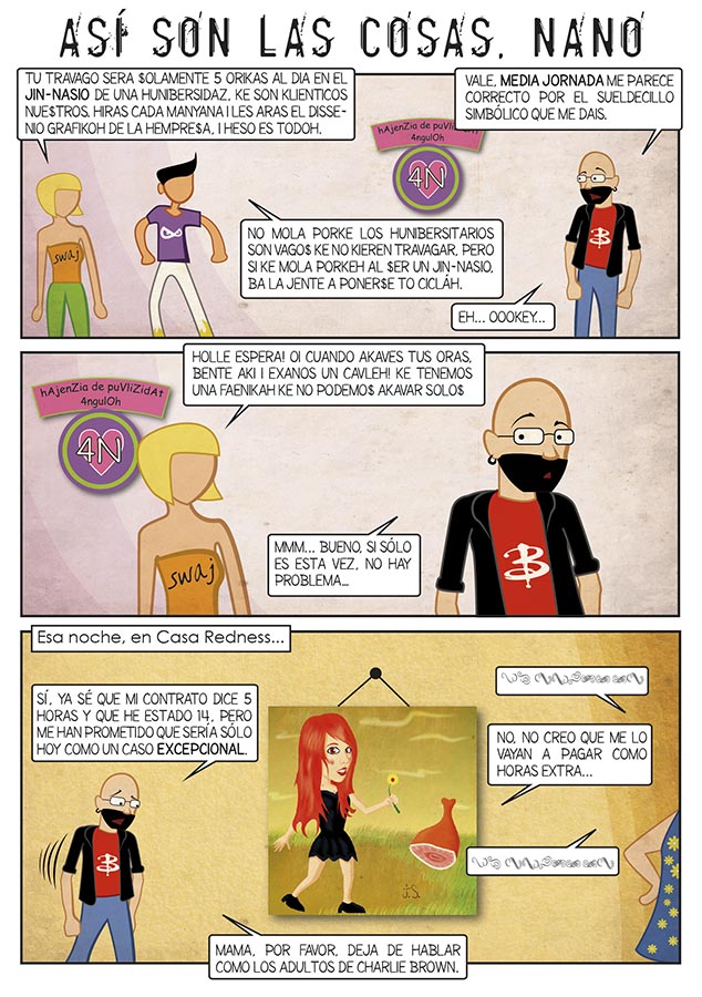 Mi primera novela gráfica fue publicada en noviembre de 2016. Empezó como un blog de tiras cómicas sobre un diseñador gráfico con jefes malvados, hasta que fue recopilado y publicado por Letrablanka Editorial. Dibujo cómico minimalista con Illustrator, al estilo South Park.